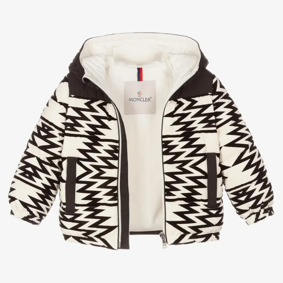Ivory and black with a zigzag pattern, this puffer jacket for little boys is by luxury French brand Moncler Enfant. Lined in comfortable cotton jersey and padded in warm yet lightweight down, it has a fixed hood and hand pockets which fasten with concealed poppers. The designer's iconic felt logo is on one sleeve, and the logo-embossed zip puller on the front adds a statement finish. The hem and cuffs are elasticated to help insulate against chilly winds.
