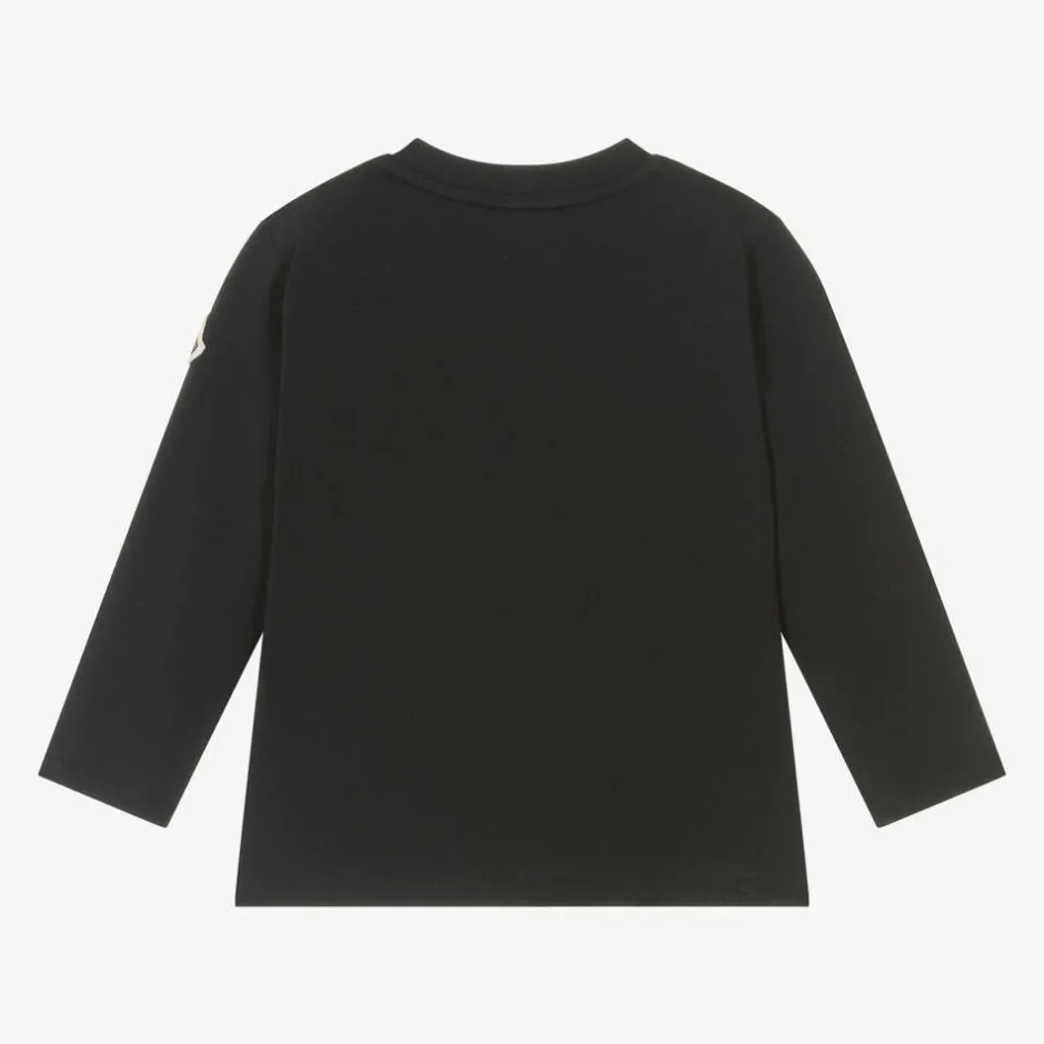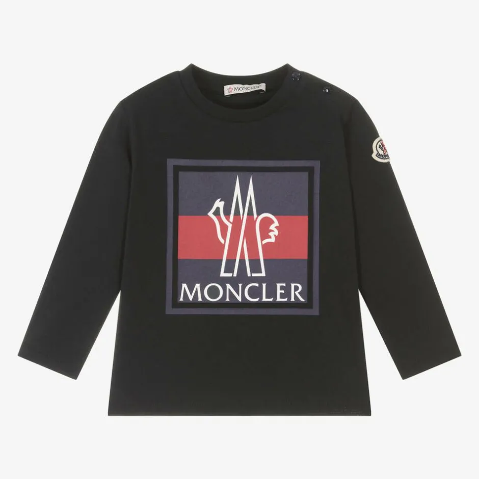 Navy blue cotton top for little boys by luxury brand Moncler Enfant. The iconic felted logo patch is stitched on one sleeve, and the signature motif is printed on the front in a bold tricolour design. It is made in soft and stretchy jersey with shoulder popper fastenings to help with over-the-head dressing.