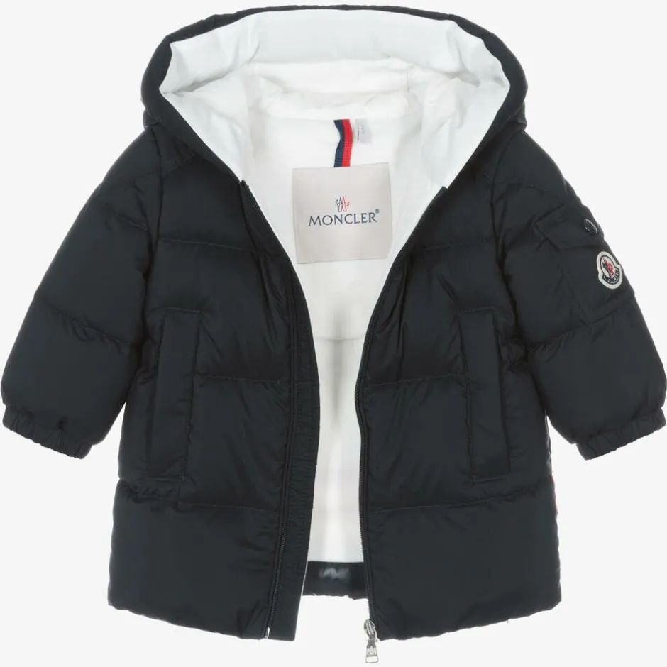 Navy blue hooded parka coat for little boys by Moncler Enfant, made in the brand's smooth, recycled longue saison fabric. Padded with luxurious down for warmth, it has a soft cotton jersey full lining and elasticated cuffs. The back has red, white and navy blue tricolour stripes across the hem. There is a small, popper-fastening pocket on one sleeve with the brand's signature felted logo patch. The popper-fastening front pockets are lined in soft jersey and the jacket fastens with a zip.