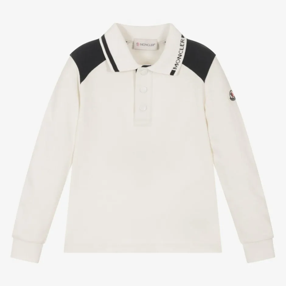 Ivory with navy blue on the shoulders, this smart-casual polo shirt for boys is by luxury brand Moncler Enfant. It is made in soft cotton piqué, with long sleeves and branded popper fastenings. It has distinctive jacquard branding on the ribbed collar and the iconic felted logo patch on one sleeve for a signature finish.