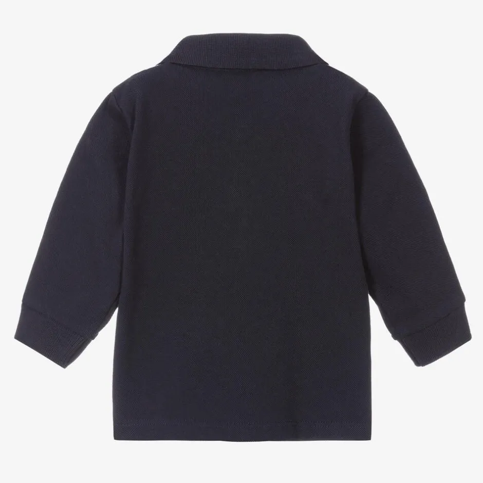Navy blue polo top for little boys by luxury brand Moncler Enfant, made in soft and stretchy cotton piqué. In a sporty style, this long-sleeved top has striped trims on the sleeves highlighted with the designer's name. The iconic felt logo patch can also be seen on the chest. There are branded popper fastenings on the front and lightly ribbed trims.