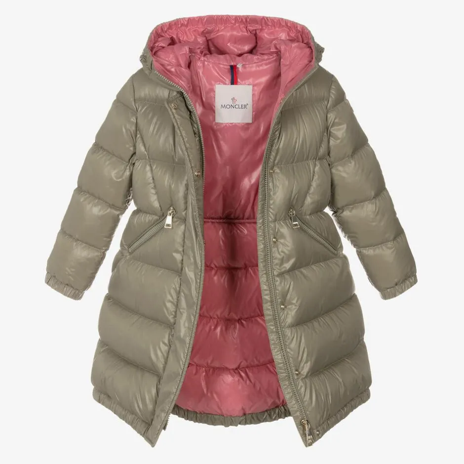Long and cosy, this khaki beige, Mini-me puffer coat for girls is by luxury brand Moncler Enfant, made in water-repellent, recycled nylon laque. Just right for chilly days, it is padded in warm down, with a fixed, padded hood. It has gently elasticated cuffs and an elasticated hemline to keep the chills out, with a popper-fastening flap over the front zip for extra protection. There are useful, zipped front pockets and a silky pink lining for comfort.