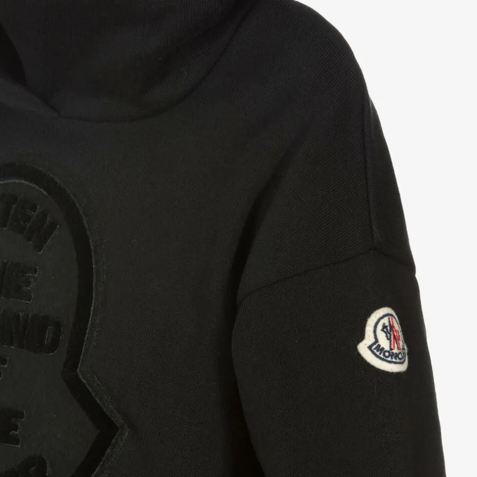 Black tracksuit for girls by luxury brand Moncler Enfant. Made in mid-weight cotton jersey, it has a soft fleecy feel inside for added comfort and warmth. The hooded top has a tonal felted appliqué logo on the front and the cuffed ankle joggers have a small branded tag on the back.