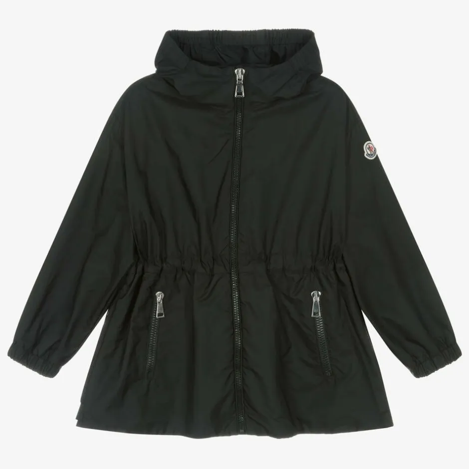 Smooth and lightweight, this black hooded coat for girls is by luxury brand Moncler Enfant and is made in recycled fabric. For a stylish silhouette, it has an internal drawstring to cinch in the waist and pretty ruffle detailing on the back. Fastening with a zip on the front, it has an iconic logo patch on one arm for a signature finish, and useful zipped pockets.