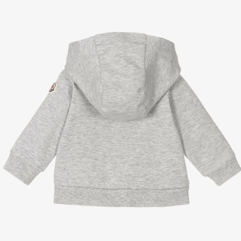 Younger girls grey marl, cotton, hooded, zip-up top by luxury designer Moncler Enfant, embroidered with the brand's logo across the chest in ivory. Made from soft sweatshirt jersey for casual comfort. The top has the brand's signature felt patch on one sleeve for added designer appeal, and a jersey lined hood for a cosy wear.