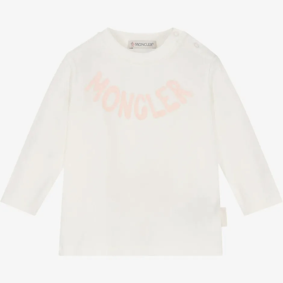 Ivory top for little girls by luxury French brand Moncler Enfant. There is a pale pink logo print across the chest, with a branded tab sewn on the side seam. Made in soft and comfortable cotton jersey, it has pink popper fastenings on one shoulder for easy dressing.