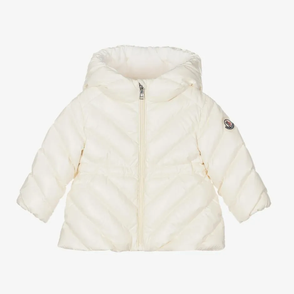 An ivory puffer coat for little girls by Moncler Enfant, with lovely diagonal quilting. Made in a matte finish with a water-repellent coating, it is luxuriously down-padded for warmth without the weight. It is designed with a gently elasticated waist for a fit and flare shape. It has a jersey-lined hood, elasticated cuffs and the iconic felted logo patch on the sleeve. A practical zip fastens on the front and concealed side seam pockets both secure with poppers.