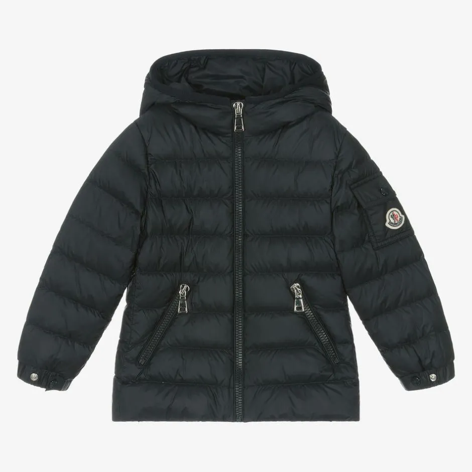 Girls navy blue Mini-me puffer jacket by luxury designer, Moncler Enfant. Softly padded with down for ultimate warmth, this zip-up jacket has a useful, attached hood for rainy days and a secure zip fastening to keep out the cold. The popper-fastening sleeve pocket is stamped with the iconic felt logo badge for an instantly recognisable designer look.