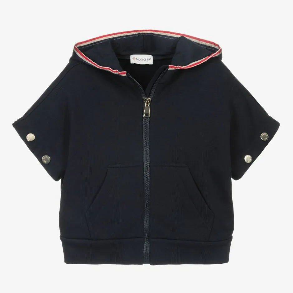 Sporty navy blue tracksuit for girls by French brand Moncler Enfant. Press studs on the sleeves allow the top to be worn with either long or short sleeves. The hooded zip-up top has sparkly gold and tricolour trims and a pouch pocket. The joggers have press stud closures at the sides, so can be worn open or closed for a relaxed look.