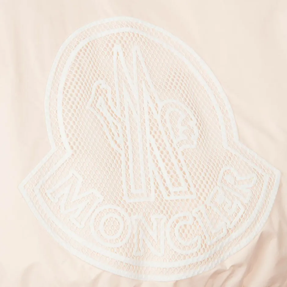 Pale pink windbreaker for girls by luxury brand Moncler Enfant, with a distinctive white mesh logo on the back. Silky smooth and water repellent, it is elasticated around the hood, cuffs and hem to help keep out chilly winds. It fastens with an exposed zip and has useful pouch pockets on the front. For a signature finish, the designer's iconic felt logo patch is appliquéd on one sleeve.