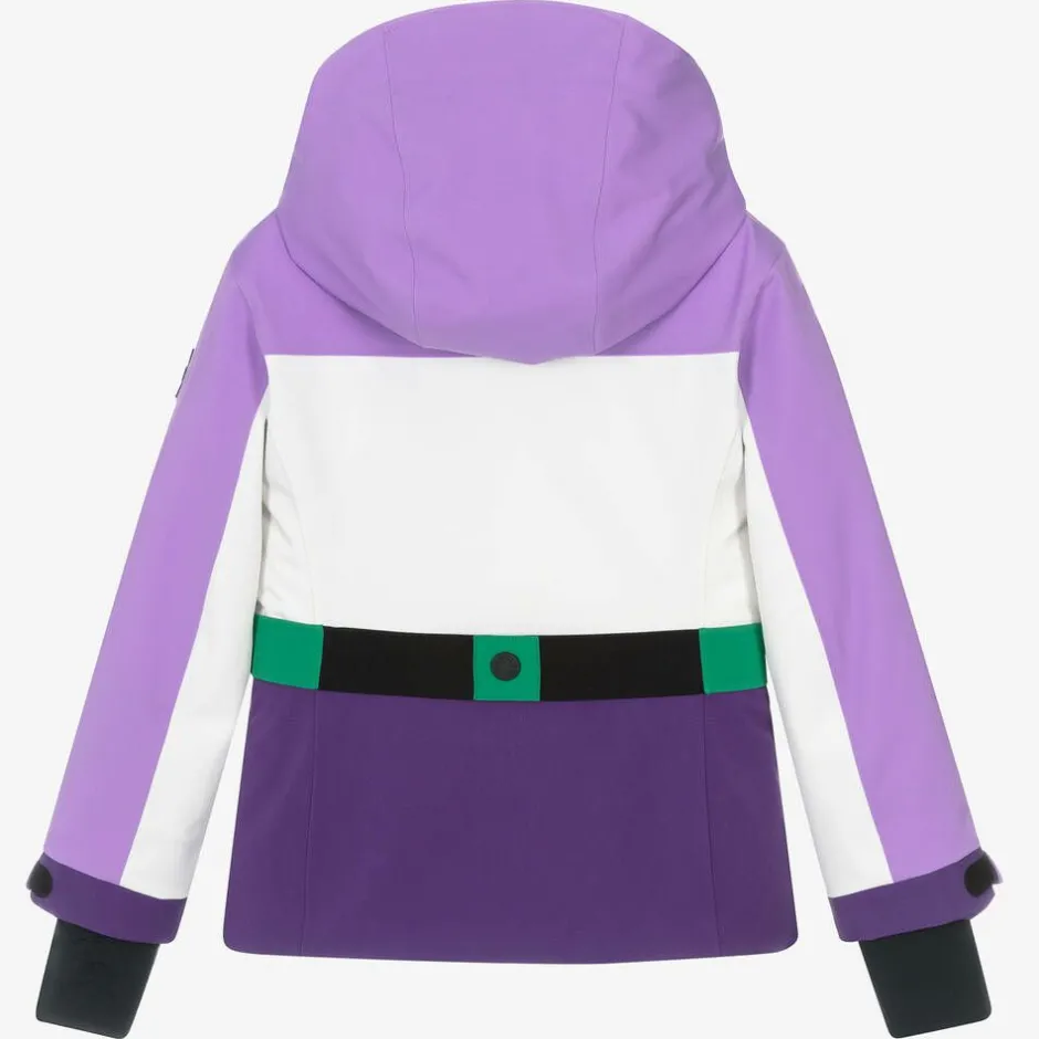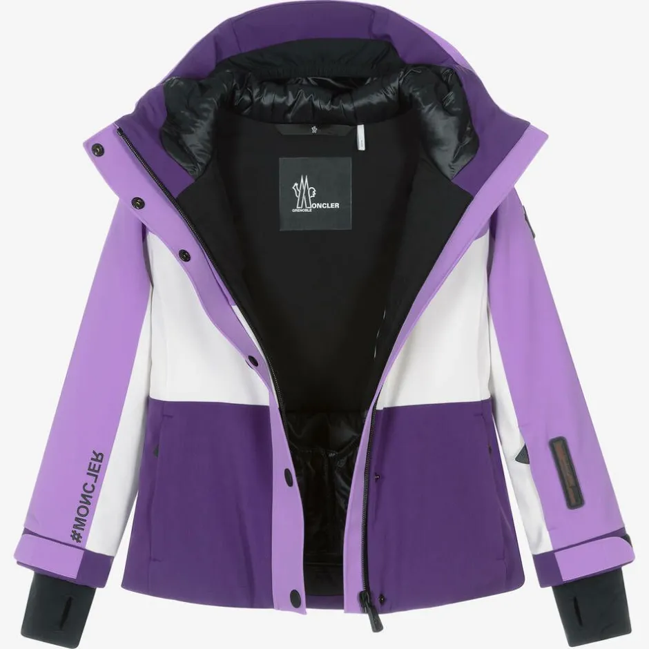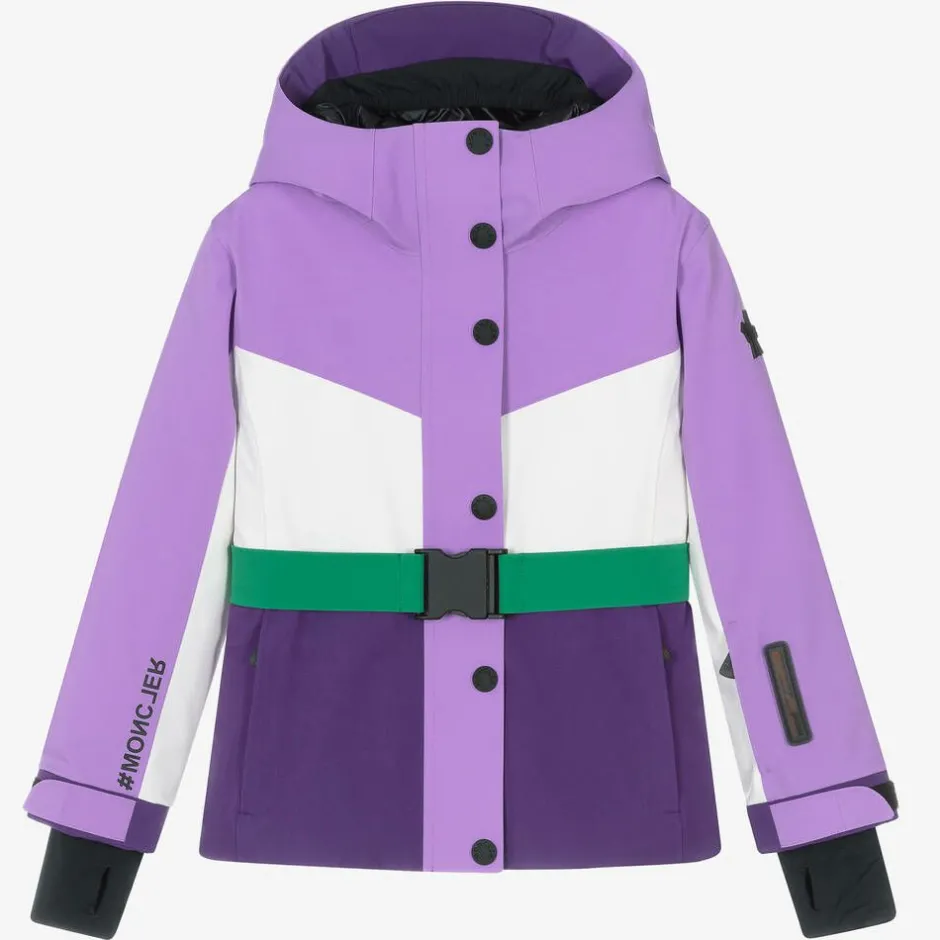 Stylish purple and white ski jacket for girls by luxury brand Moncler Enfant, ideal for keeping your child warm and safe on the slopes. In a colourblock style, it fastens with a zip and poppers on the front and has a zip fastening ski pass pocket on one sleeve. The cuffs have velcro trims for an adjustable fit around gloves, and the hood has an internal elasticated trim for a secure fit around a ski helmet. The technical jacket incorporates RECCO reflector technology, helping track skiiers in harsh conditions. It has an internal snow skirt to keep your child dry on the slopes, and has a '#MONCLER' matte logo on one sleeve for a finishing branded touch. For maximum warmth without the weight, it has a Primaloft padding made from recycled plastic bottles for an eco feature. A bright green buckle belt completes the look with a bold pop of contrasting colour.
