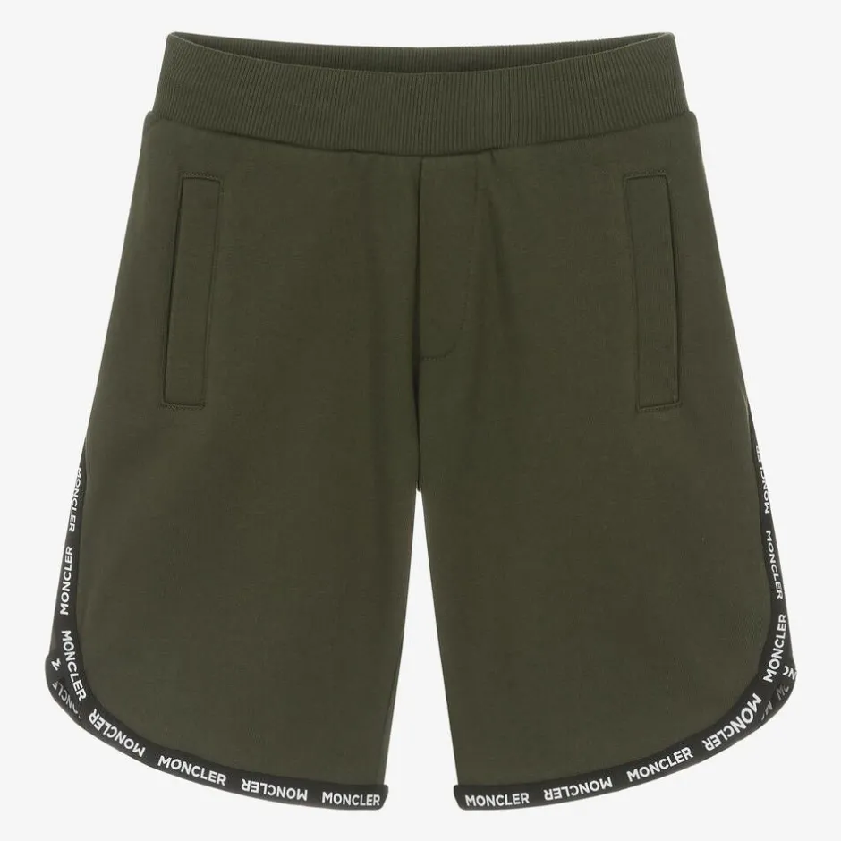 Khaki green shorts for boys by luxury French brand Moncler Enfant. Made in comfortable cotton jersey with a looped underside, they have black and white logo tape trims. They have a useful internal drawstring waist and a black rubberised logo patch on the back.