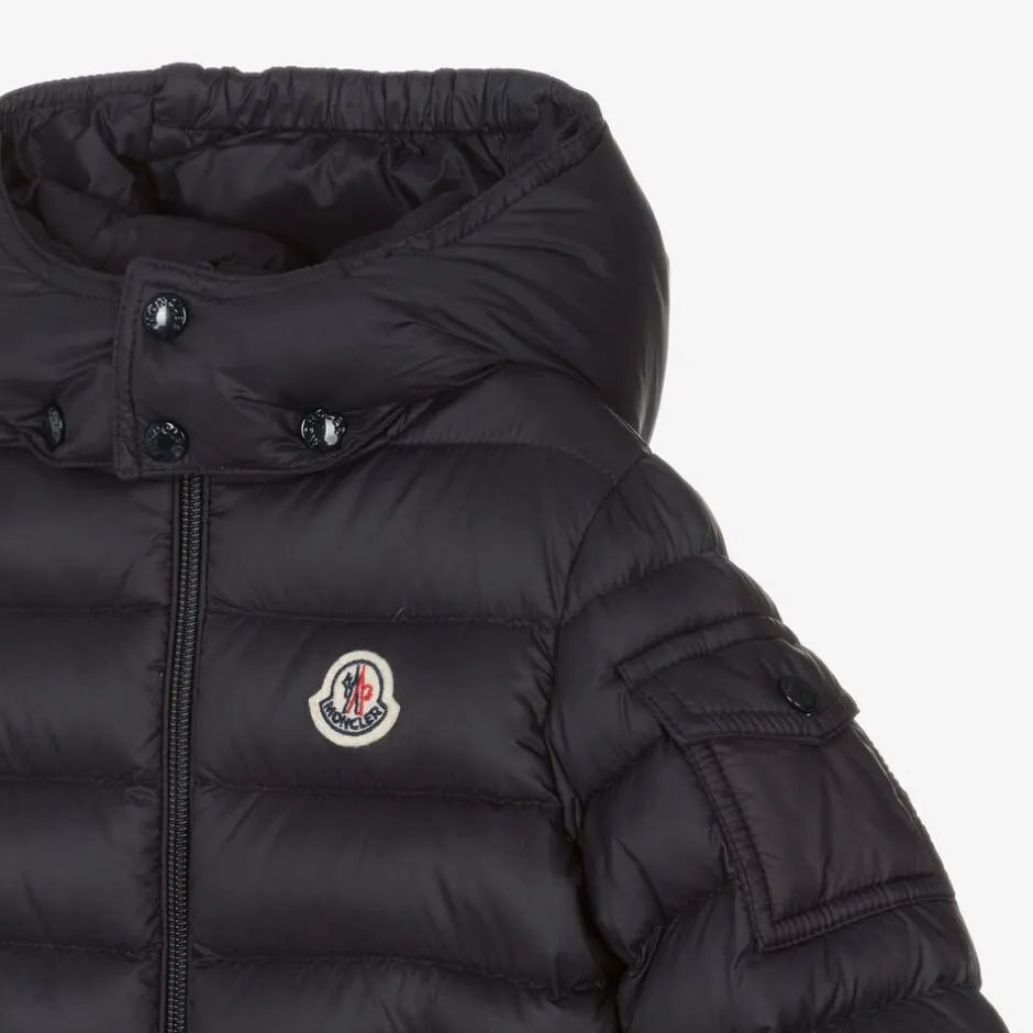 Navy blue puffer jacket for little boys and girls from luxury brand, Moncler Enfant. Silky smooth with a matt water-repellent finish, it is down-padded for excellent warmth without the weight. This zip-fastening jacket is designed with a high collar, a detachable hood that fastens with poppers, and elasticated cuffs. There are zip-fastening front pockets and a patch pocket with a popper on one sleeve. For an iconic Moncler look, the felted logo patch can be seen on the chest.