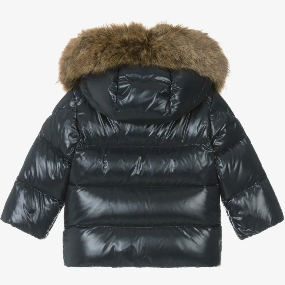Navy blue zip-up puffer jacket for little boys and girls by luxury brand Moncler Enfant. Luxuriously down padded, it is made in silky smooth nylon laquƩ with a shiny water-repellent finish and has elasticated cuffs to keep the warmth in. Stylish yet cosy, it features a detachable hood with removable faux fur trim, three front pockets with branded poppers, and the iconic felt logo patch appliquƩd on one sleeve.