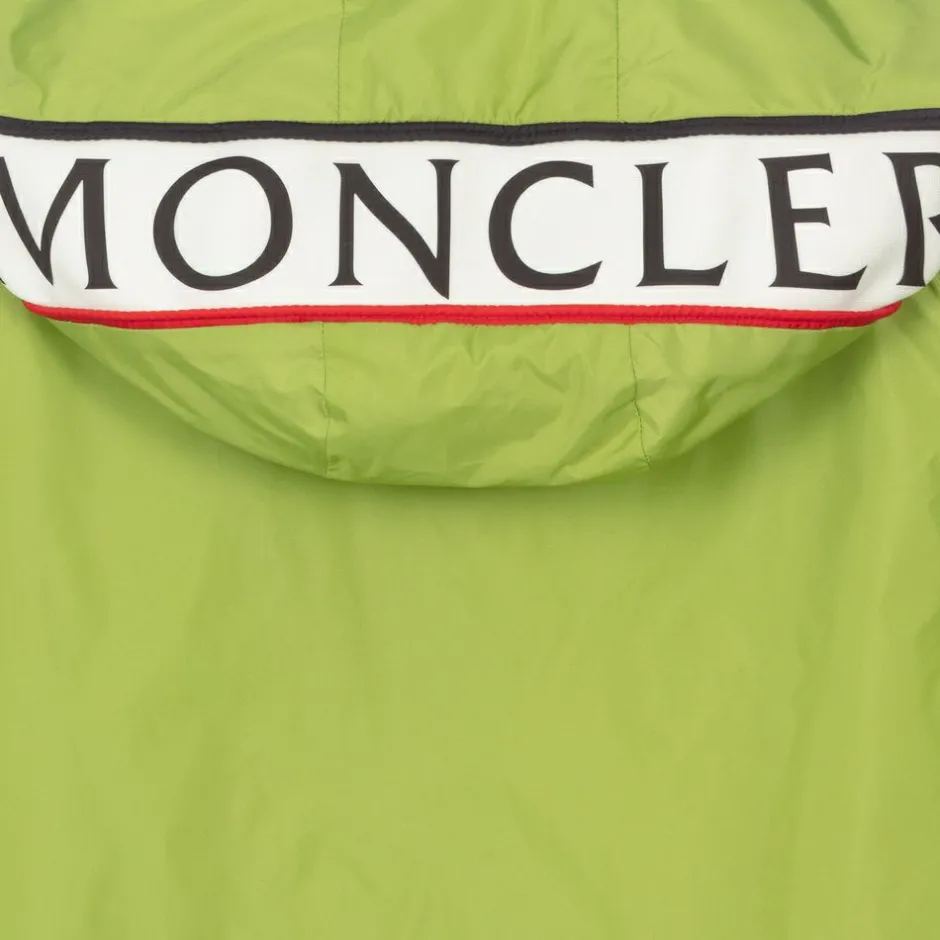 Teen boys green zip-up windbreaker jacket by luxury French brand Moncler Enfant. Made and fully lined in smooth water repellent nylon, it has red and navy blue piped trims on the sleeves and hood. The hood has a white jersey panel with a navy blue logo print. There are popper fastening pockets and the iconic logo patch is on the front.