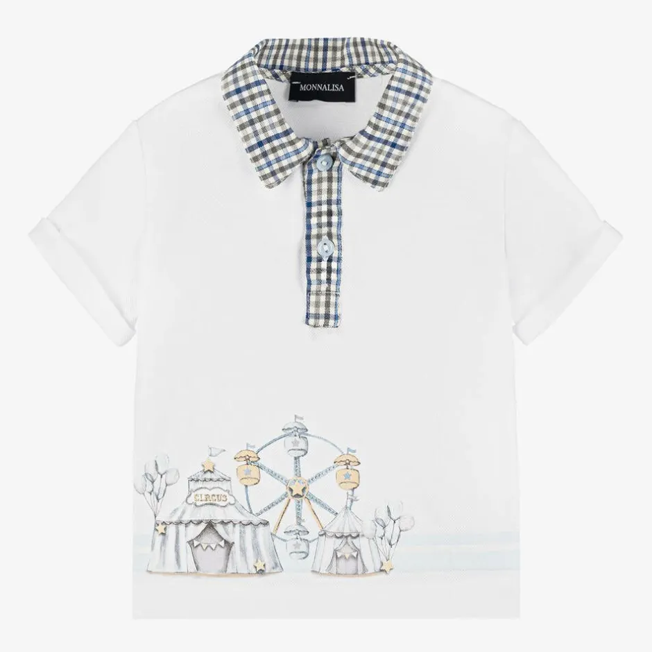White polo shirt for little boys by Monnalisa, made in lightweight cotton piqué. Cool and comfortable, it has a fun circus design printed above the hem and turned-up cuffs on the short sleeves. The collar and button-up placket are designed in a blue and grey check print for a stylish finish.