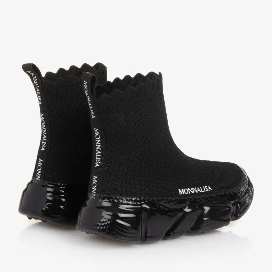 Black sock trainers for girls by Monnalisa, made in soft mesh textile with a scalloped trim. Lightweight and easy to wear, they have a branded pull tab on the back, a white logo print on one side and a cushioned insole for comfort. The non-slip rubber outer sole has a lovely glossy sheen and improves grip on slippery surfaces.