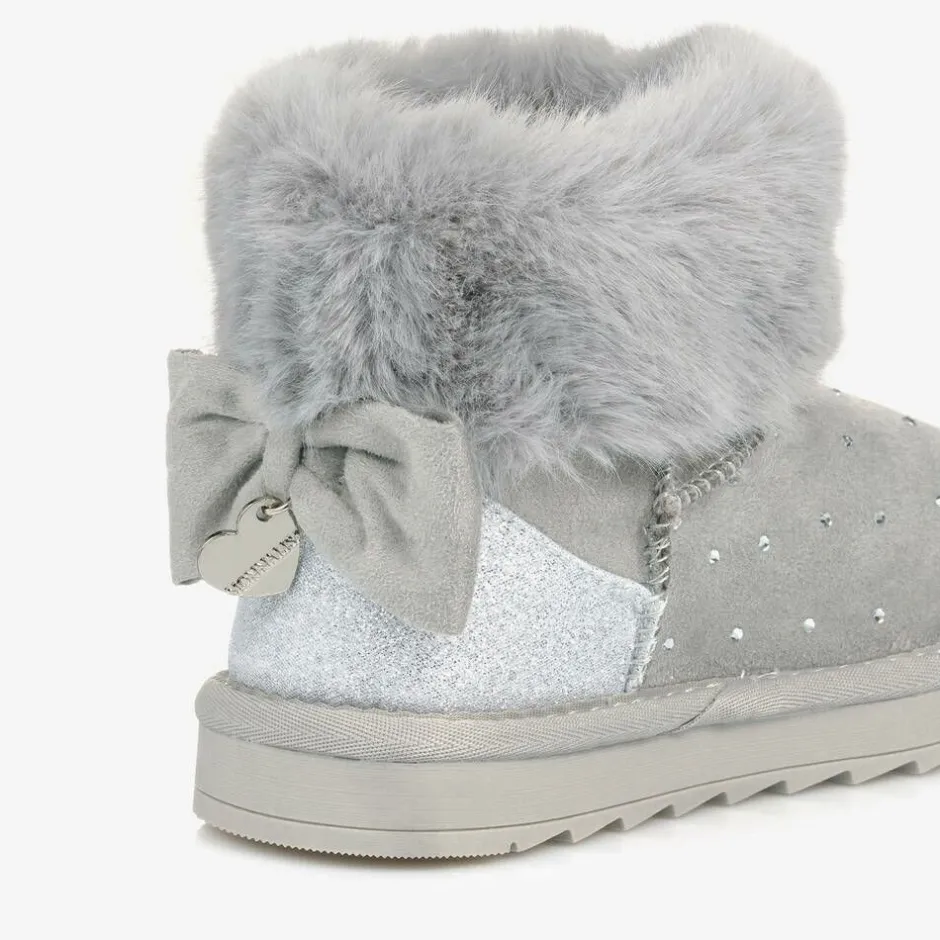 Gorgeous grey ankle boots for girls by Monnalisa. Made in faux suede with a faux fur lining and trim, they are patterned with sparkling diamantés. Completing the glamorous look, the heel is trimmed in glittery silver with a bow and heart logo charm detail. The flexible rubber outer sole is textured for good grip.