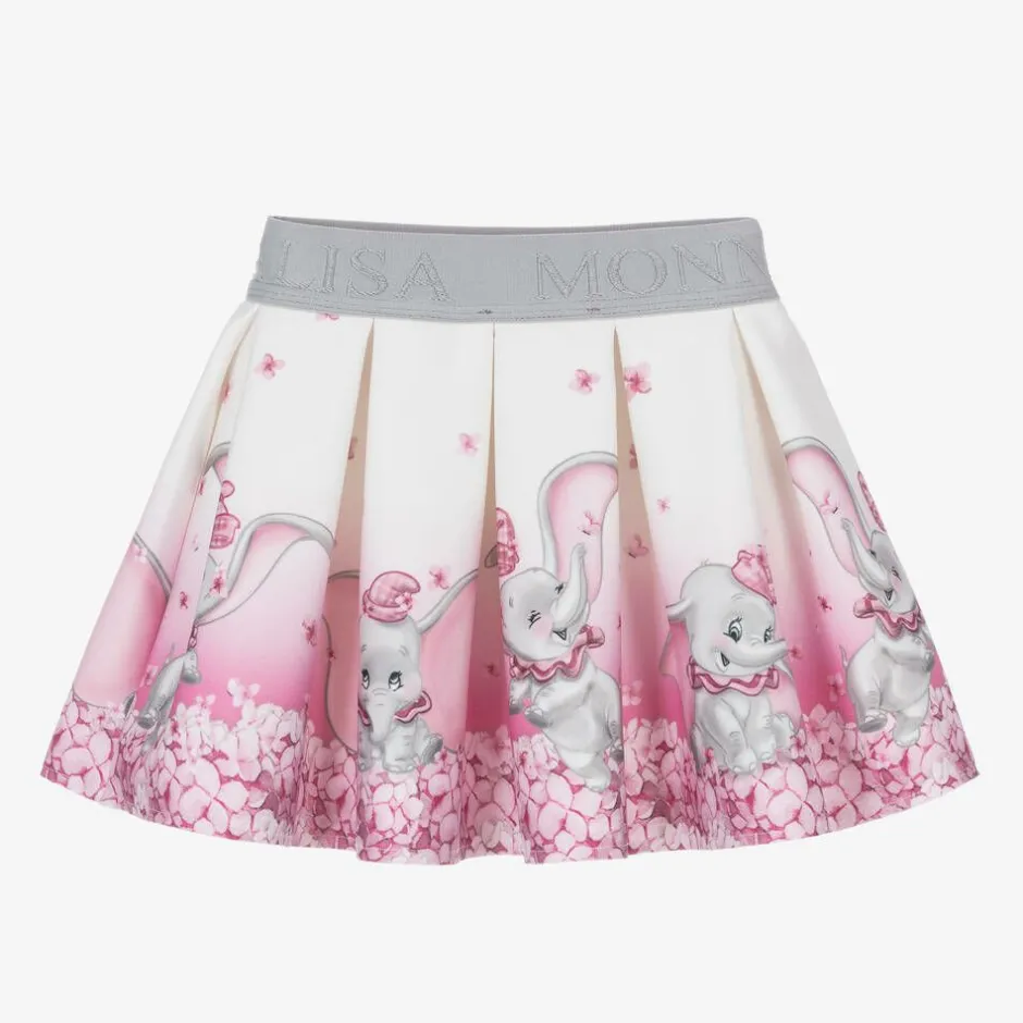 Ivory and pink box-pleated skirt for little girls by Monnalisa, made in soft lightweight neoprene. This pretty skirt is printed with super cute Dumbo characters playing in pink petals. Gentle on little tummies, the grey waistband is softly elasticated and designed with jacquard branding. This lovely skirt has a soft cotton and viscose blend lining for comfort.