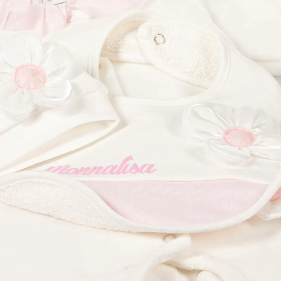 In pale ivory with pink trims, a beautiful babysuit set for girls by Monnalisa. Each piece is decorated with a pretty organza flower appliqué. The babygrow is made in cosy cotton velour, with a voile ruffle collar and front popper fastenings. The hat and logo-branded bib are made in soft cotton jersey, with the bib lined in absorbent towelling and securing with a single popper behind the neck.