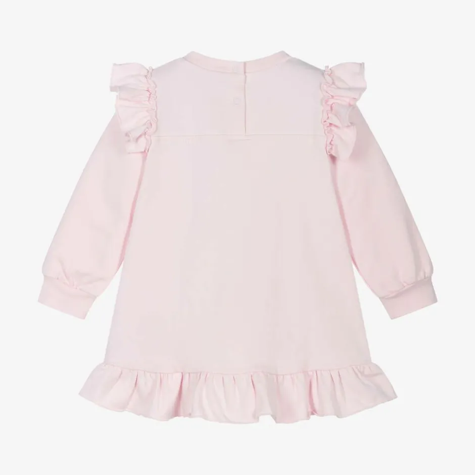 A delightful pink sweatshirt dress for younger girls by Monnalisa, made in soft cotton jersey with a warm, fleecy inside. This cosy style features Disney's adorable Dumbo character on the front detailed with sparkling diamantés. It has lightly ribbed cuffs, sweet ruffles over the shoulders and a pretty frilled hem. To help with dressing, there are popper fastenings on the back.