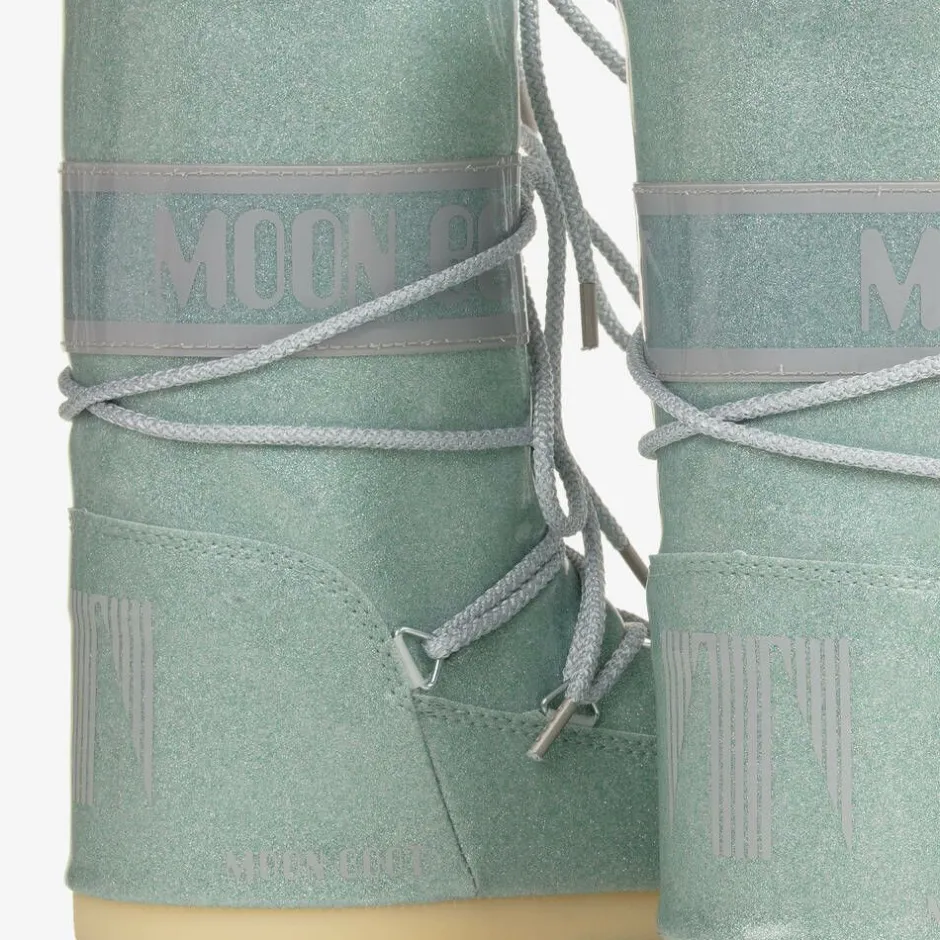 Glittery light blue snow boots for girls by Moon Boot, inspired by the 1969 moon landing. Glossy, water-repellent and heavily padded for warmth, they have decorative tie-up laces. The thermoplastic rubber soles feature tiny suction cups for added grip on slippery surfaces. The technological foam lining will feel snug at first but will mould to the size and shape of the foot after a few hours of wear. Bold logo branding completes the statement après-ski look.