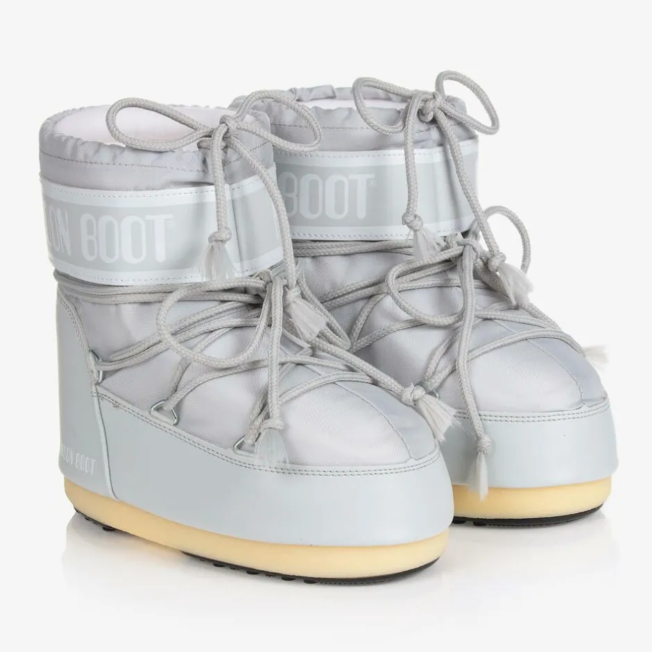 Grey and white shorter-length for boys and girls, by Italian brand Moon Boot, with a bold logo printed panel for an iconic look. Heavily padded and ultra resistant in the signature style, they feature a two-tone thermoplastic sole with little suction pads at the bottom for better grip. They have faux leather trims with further logo branding, a stylish lace-up look and a drawstring tie on the ankle cuffs for a warm and comfortable fit. The technological foam lining will feel snug at first but will mould to the size and shape of the foot after a few hours of wear.