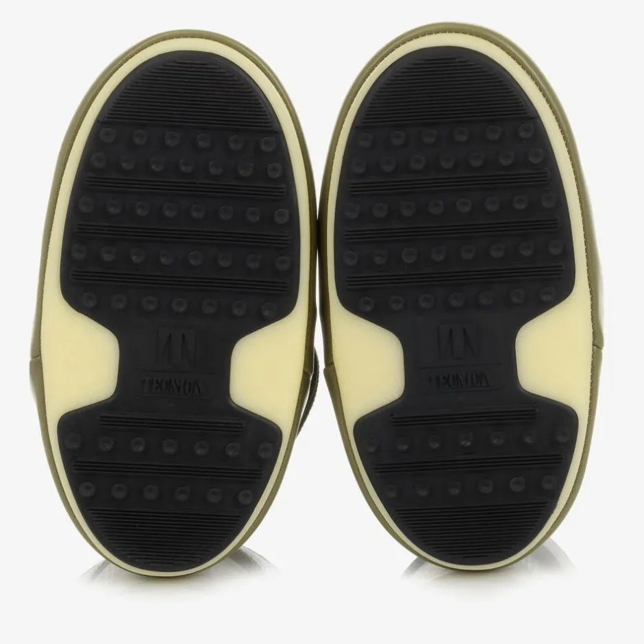 Khaki green and white shorter-length for boys and girls, by Italian brand Moon Boot, with a bold logo printed panel for an iconic look. Heavily padded and ultra resistant in the signature style, they feature a two-tone thermoplastic sole with little suction pads at the bottom for better grip. They have faux leather trims with further logo branding, a stylish lace-up look and a drawstring tie on the ankle cuffs for a warm and comfortable fit. The technological foam lining will feel snug at first but will mould to the size and shape of the foot after a few hours of wear.