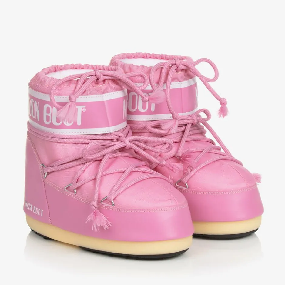 Pink and white shorter-length for boys and girls, by Italian brand Moon Boot, with a bold logo printed panel for an iconic look. Heavily padded and ultra resistant in the signature style, they feature a two-tone thermoplastic sole with little suction pads at the bottom for better grip. They have faux leather trims with further logo branding, a stylish lace-up look and a drawstring tie on the ankle cuffs for a warm and comfortable fit. The technological foam lining will feel snug at first but will mould to the size and shape of the foot after a few hours of wear.