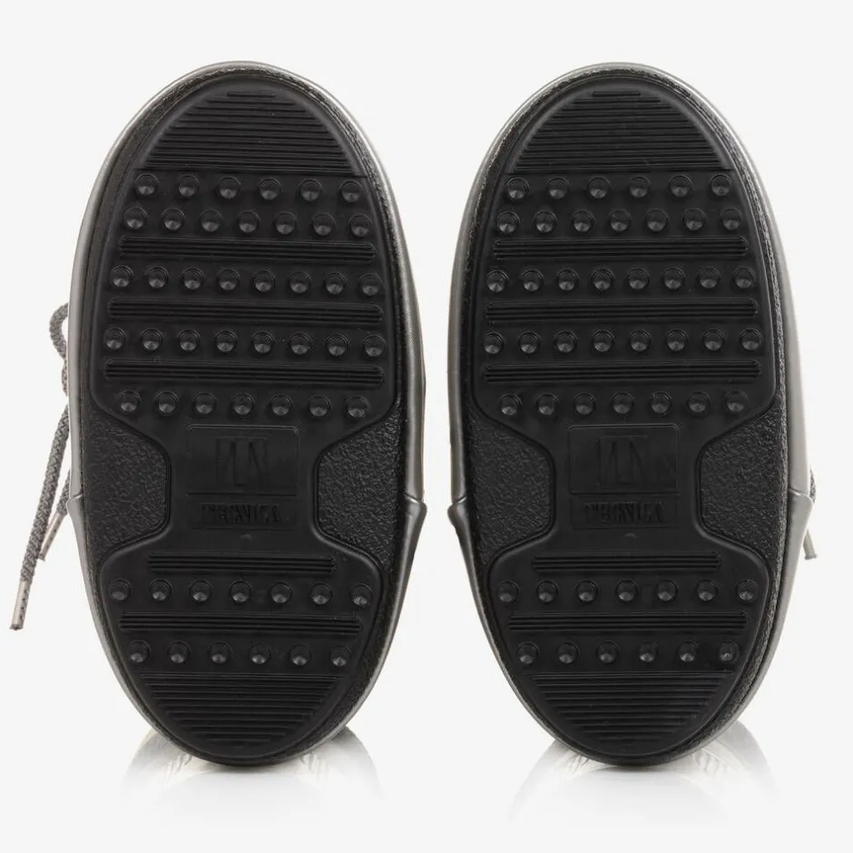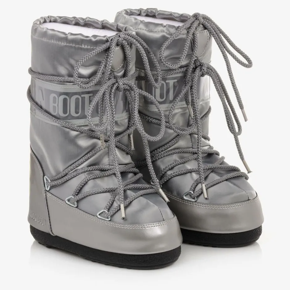 Silver snow boots for boys and girls by Moon Boot, made from a cool matte effect satin. A lovely addition to their après-ski wardrobe, they are heavily padded and ultra resistant in the signature original style. With a futuristic look, they have distinctive logo branding, decorative tie-up laces, and a drawstring on the cuffs to lock in warmth. The thermoplastic non-slip rubber soles, with tiny suction cups, add grip. The technological foam lining will feel snug at first but will mould to the size and shape of the foot after a few hours of wear.