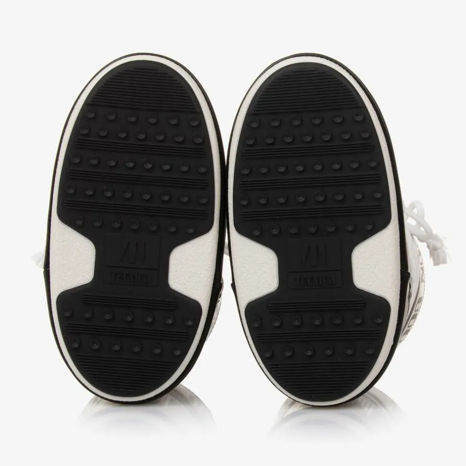 White and black shorter-length snow boots for boys and girls by Moon Boot, with a bold logo print panel for an iconic look. Heavily padded and ultra resistant in the signature style, they feature a two-tone thermoplastic sole with little suction pads at the bottom for better grip. They have branded faux leather trims, a stylish lace-up look and drawstrings on each ankle to lock in warmth. The technological foam lining will feel snug at first but will mould to the size and shape of the foot after a few hours of wear.