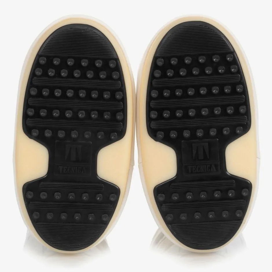 White snow boots for boys and girls by Moon Boot, with a silver logo print panel for a bold, branded look. Heavily padded and ultra resistant in the original style, they feature a two-tone thermoplastic sole with little suction pads at the bottom for improved grip. They have faux leather trims, a stylish lace-up look and a drawstring ties on the ankles to lock in warmth. The technological foam lining will feel snug at first but will mould to the size and shape of the foot after a few hours of wear.
