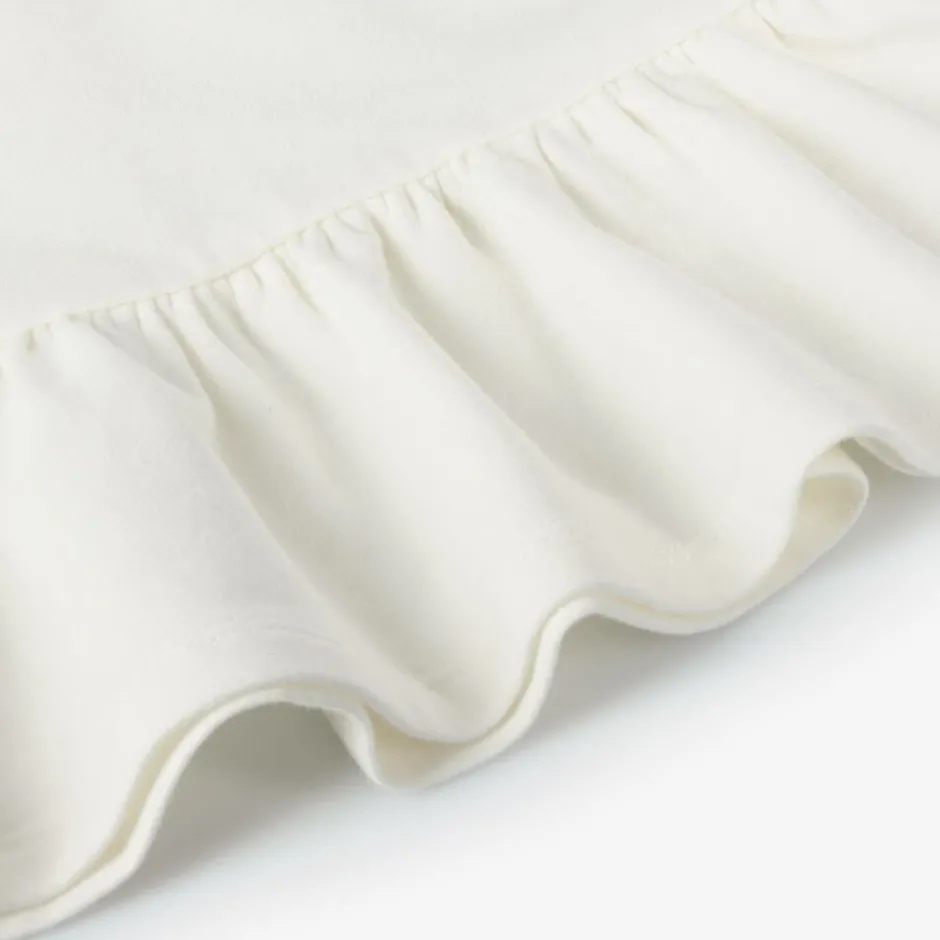 A sweet ivory dress for little girls by Moschino Baby, made in comfortable cotton jersey with added stretch. Paired with tights or worn alone, this sweatshirt-style dress has a super soft inside and colourful logo lettering on the front in a gingham check pattern. It has ribbed trims and a ruffled hem for a cute look. Easy poppers on one shoulder help to pull it over the head.