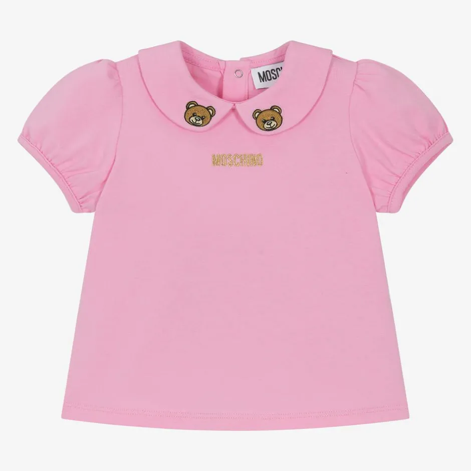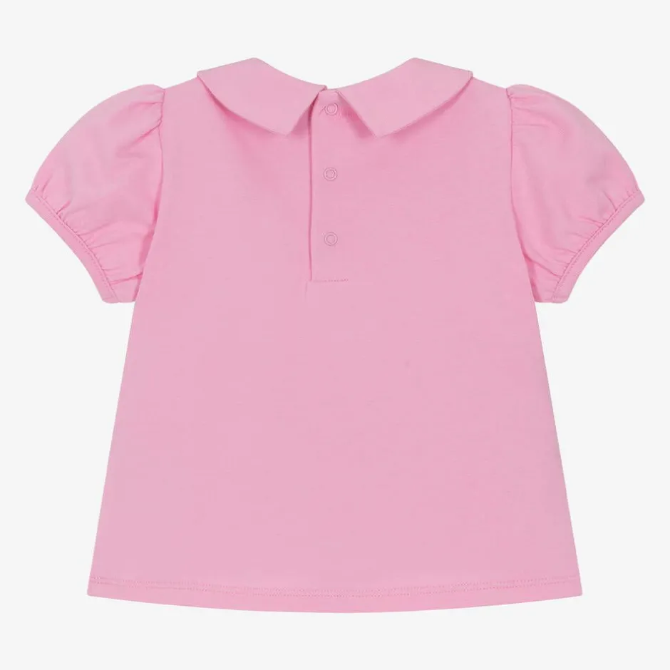 Cute pink T-shirt for little girls by luxury Italian brand Moschino Baby, made in soft, comfortable, cotton jersey. It has pretty puffed sleeves and fastens with poppers on the back. The designer's iconic Moschino Teddy Bears are embroidered on the sweet Peter Pan collar, and a glittery gold logo is embroidered on the chest.
