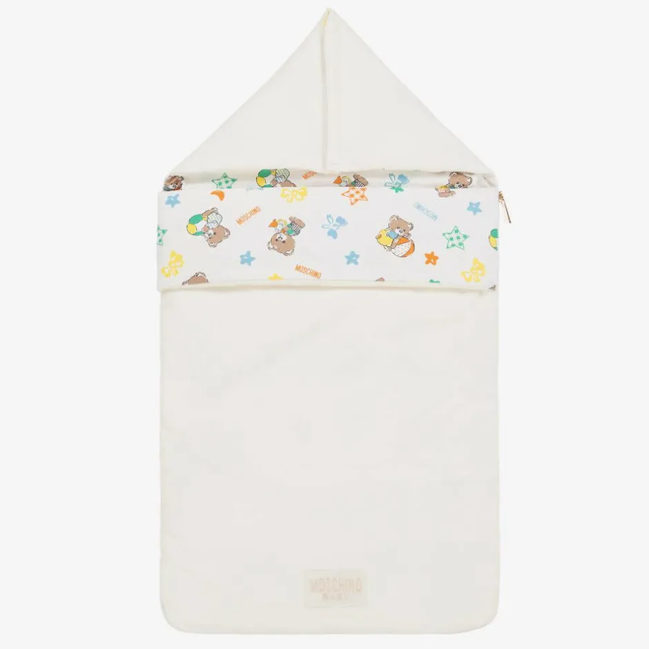 Super sweet, this ivory cotton nest for baby boys and girls is by Moschino Baby. Lightly padded, it is made from needlecord with a soft jersey lining, printed with a fun and colourful Moschino Teddy Bear logo pattern. Fastening with a zip on the side and the base, it has practical openings on the back for use in a car seat or stroller and is stitched with a tonal branded patch for a distinct finish. There are velcro strips on the hood so it can be unfastened and laid flat like a pillow.