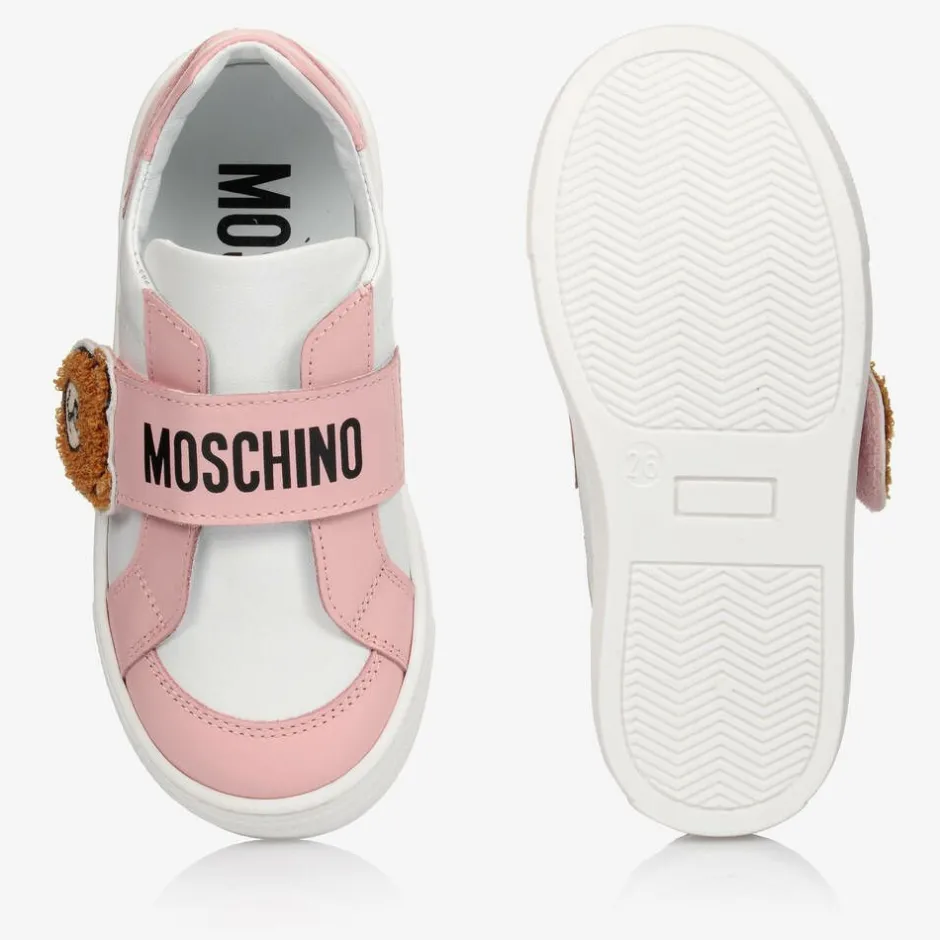 Younger girls white and pink leather trainers by Moschino Baby. They are detailed with the brand's fluffy Teddy Bear appliqués and black logo print on the straps, which fasten with velcro for easy slip-on. Lined in soft leather with a cushioned insole, they have a white non-slip rubber outsole.