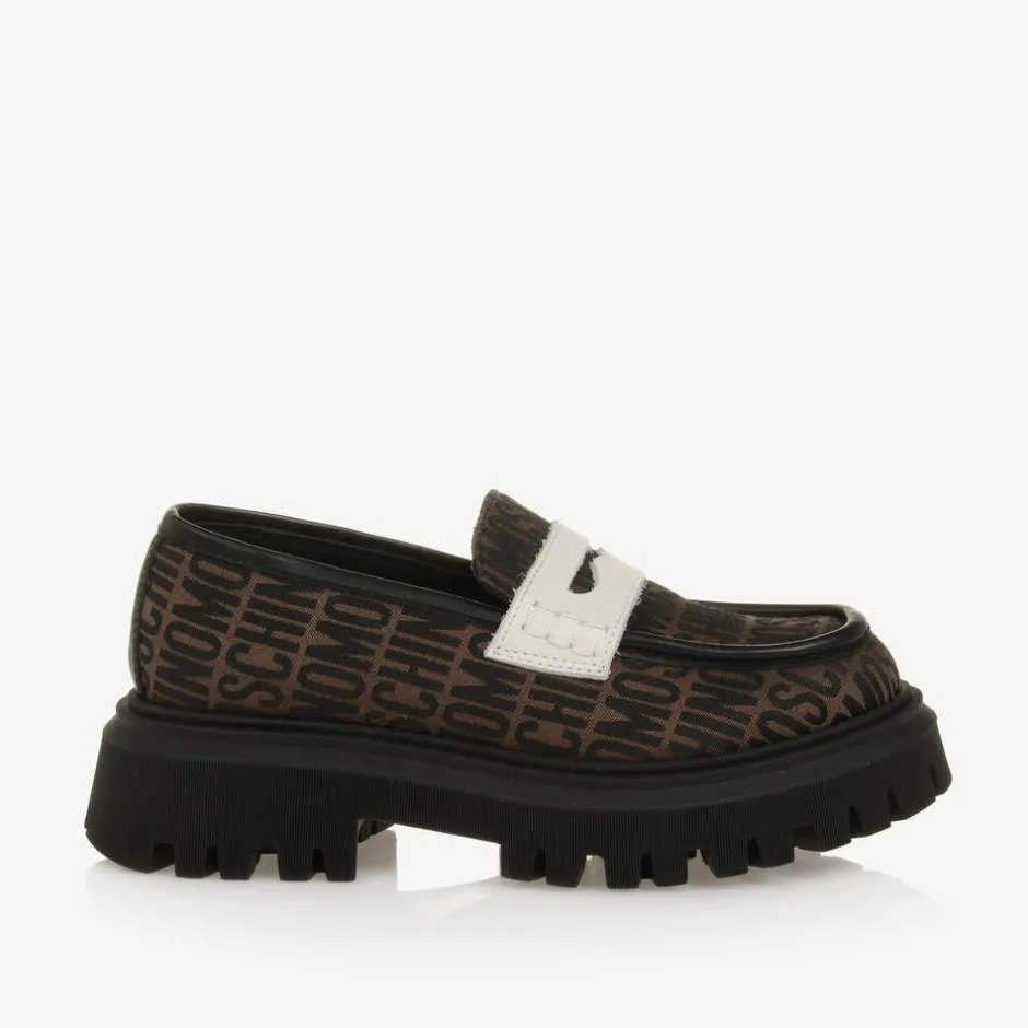 Brown slip-on loafers for boys and girls by Moschino. Trimmed with leather, the textile uppers are covered with black jacquard lettering and feature a contrast white panel for that classic loafer look. The leather lining and insole ensure comfort and the super-chunky, non-slip rubber sole adds an edgy feel.