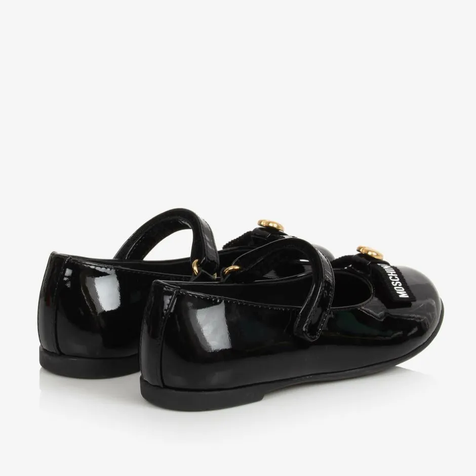 Black patent leather pumps for girls by Italian brand Moschino. Catching the light with their glossy finish, these round-toe pumps have a grosgrain ribbon bow detail with bold white logo lettering. There is a gold-tone heart stud on the front and a narrow velcro strap across the foot to adjust and secure the fit. They have a smooth leather lining and a flexible rubber sole with a textured tread.