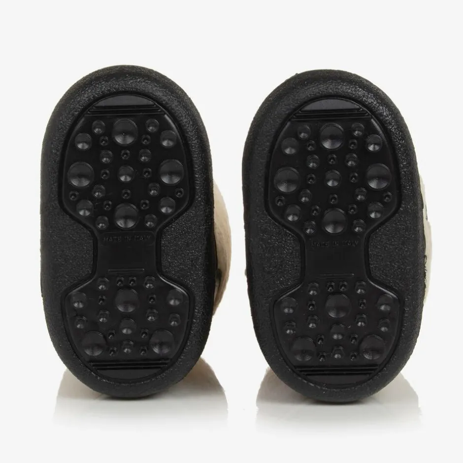 Ivory sherpa fleece snow boots for boys and girls by Italian brand Moschino, with black faux leather trims. Ideal for cold weather, these boots have a warm fleecy lining and an adjustable drawstring tie around the top for a snug fit. There are chunky non-slip rubber soles for good grip, with logo tape trim down one side adding a designer touch.