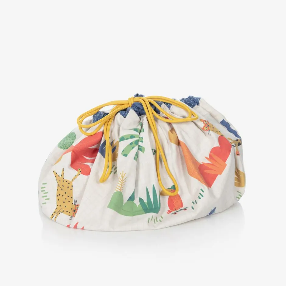 A unique 2-in-1 ivory playmat and storage bag for baby boys and girls from French brand Moulin Roti. It features a blue check pattern with colourful birds on one side and cute safari animals on the reverse, with blue patterned trim adding a lovely contrast. Lightweight yet durable, it is made in softly woven canvas with a handy drawstring around the edge, allowing the playmat to transform into a practical storage bag.