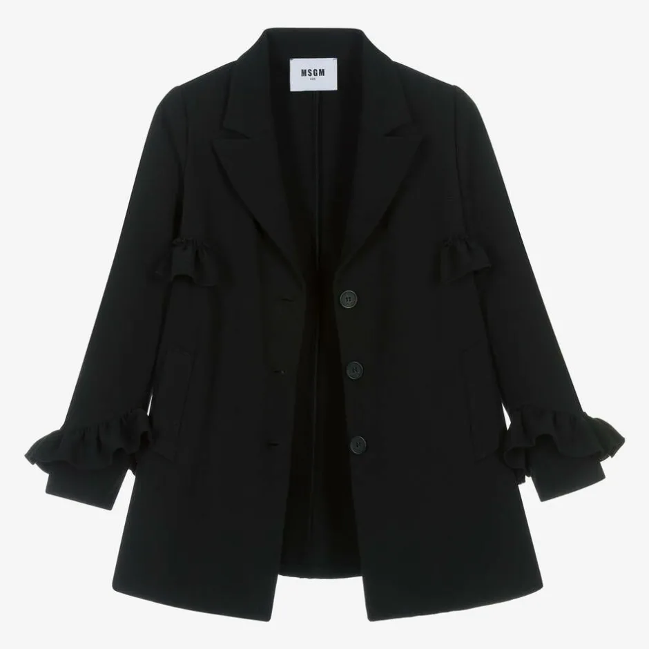 Black coat for girls by Italian brand MSGM, made in a soft, mid-weight viscose blend. This stylish, smart coat has a notched collar and pretty frill trims on the cuffs and sides. There are front pockets and a removable buckle-fastening belt, which also has a frill. It fastens neatly on the front with branded buttons and, for a subtle designer finish, it has a black and white logo patch on the back.