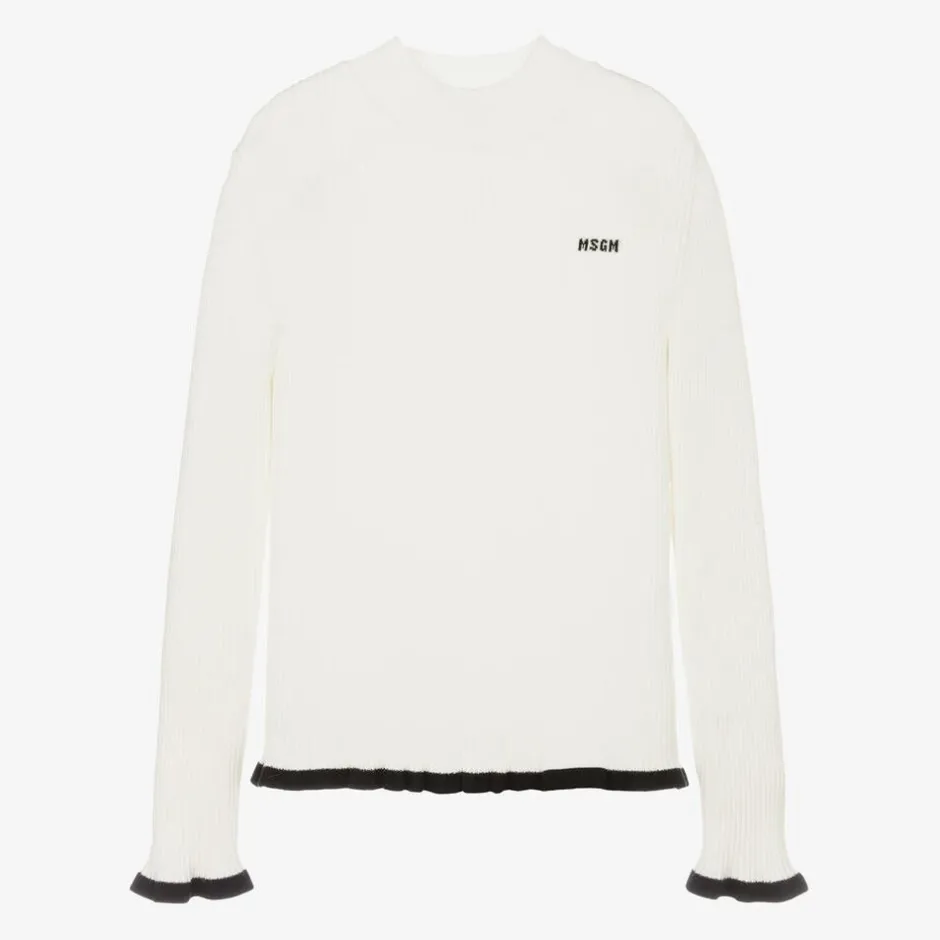 Ivory turtleneck sweater for girls by MSGM, knitted in a soft viscose blend. Stretchy and ribbed, it has an intarsia logo design on the front and black fluted trims on the sleeves and the hem.