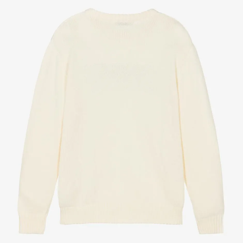 Ivory sweater for boys and girls by MSGM, knitted in super soft, mid-weight cotton. This casual jumper has cosy ribbed trims, dropped shoulders and a black intarsia brushstroke logo across the front for instant brand recognition.