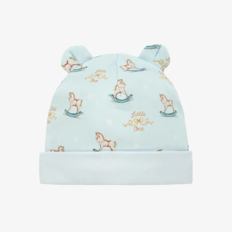 Pale blue layette hat for baby boys from My Little Pie, made in wonderfully soft, organic Supima cotton. It has a charming rocking horse pattern, with the words 'Little One' adding a sweet touch. Comfortable to wear, it has a turn-up brim and cute 3D ears on the top.