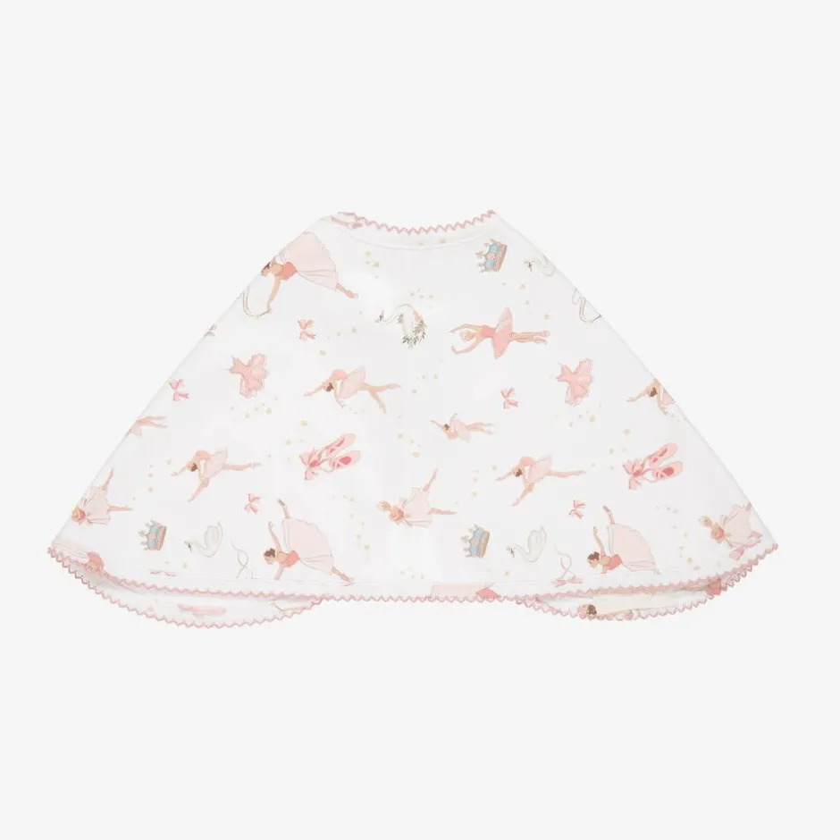 White burp cloth for baby girls from My Little Pie, patterned with a charming ballerina and swan design in pink. Made in super soft, organic Supima cotton jersey, this generous sized feeding accessory has a unique shape making it ideal as a burping cloth. It can also be used as an absorbent bib, securing easily with a popper.