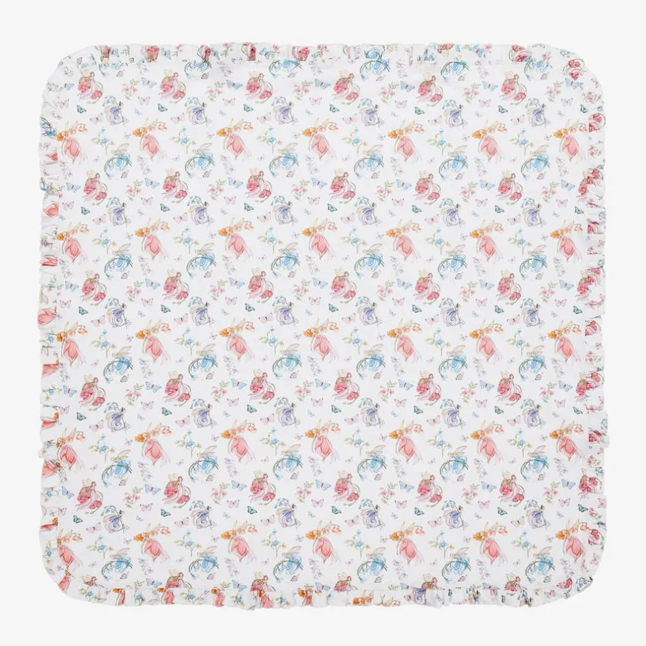 Patterned in a delightful flower fairy print in blue and pink, this white blanket for baby girls is by My Little Pie. It is made in a double layer of super soft organic Supima cotton jersey, with a pretty ruffle trim. Ideal for use in the car seat or stroller, it also makes an attractive nursery accessory.