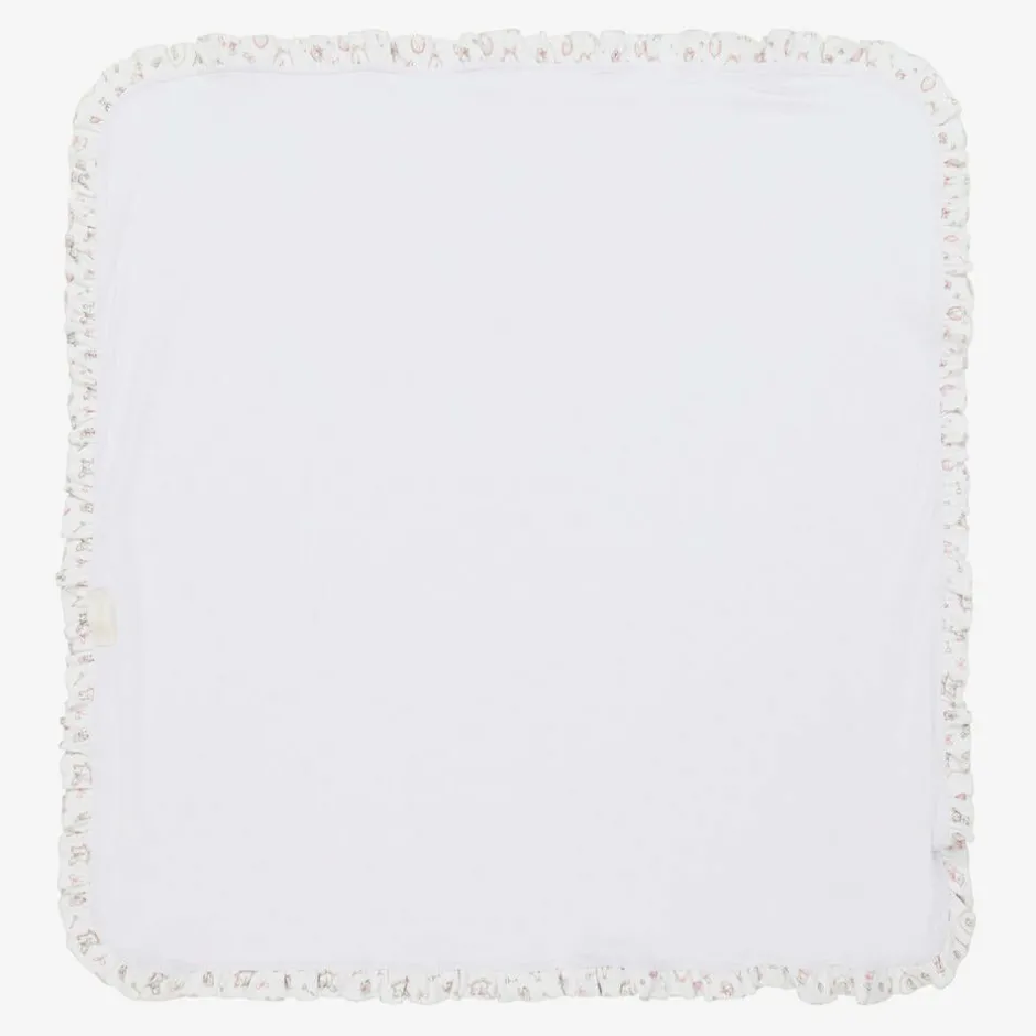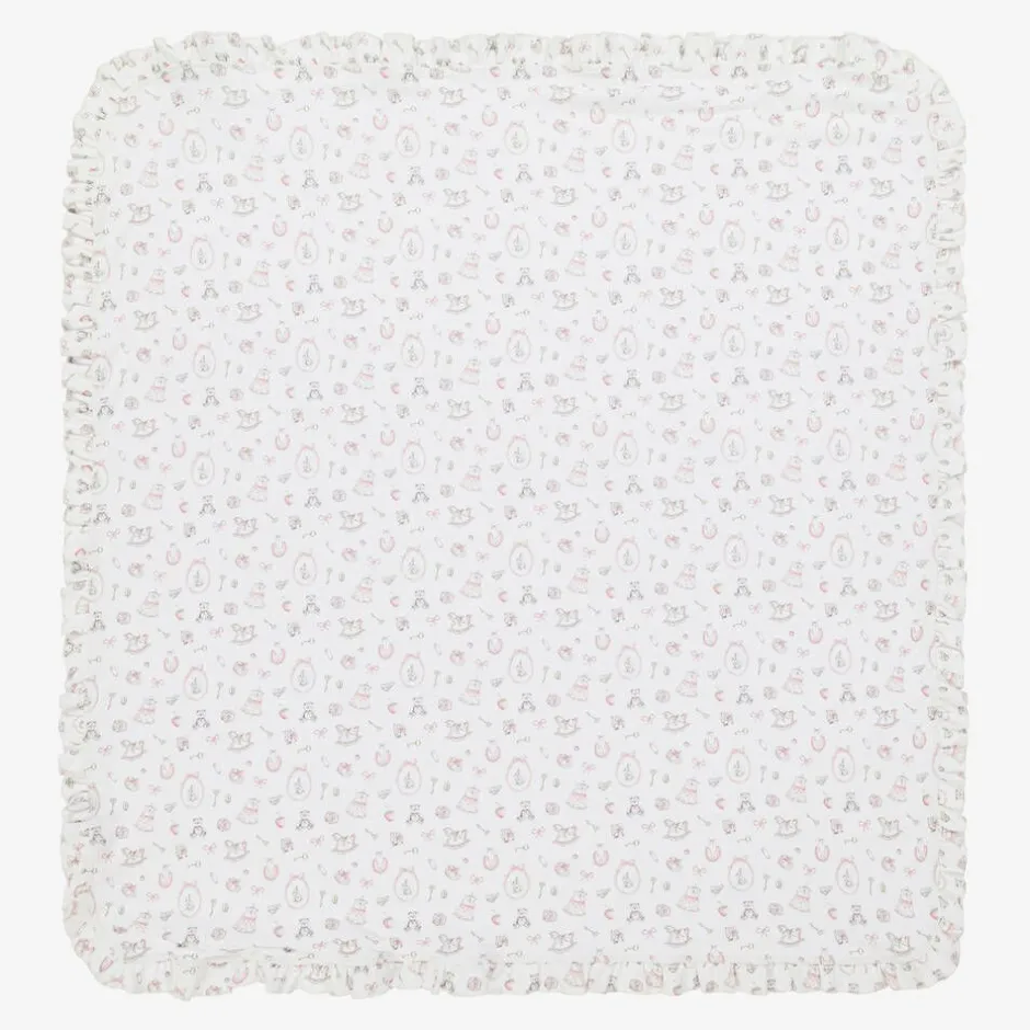 White jersey blanket for baby girls by My Little Pie, made in soft organic Supima cotton. Making a lovely addition to the nursery, it has a pretty pink and grey design featuring nursery toys, bunny rabbits, dresses and bows. It has a pretty ruffle trim all around for added charm.