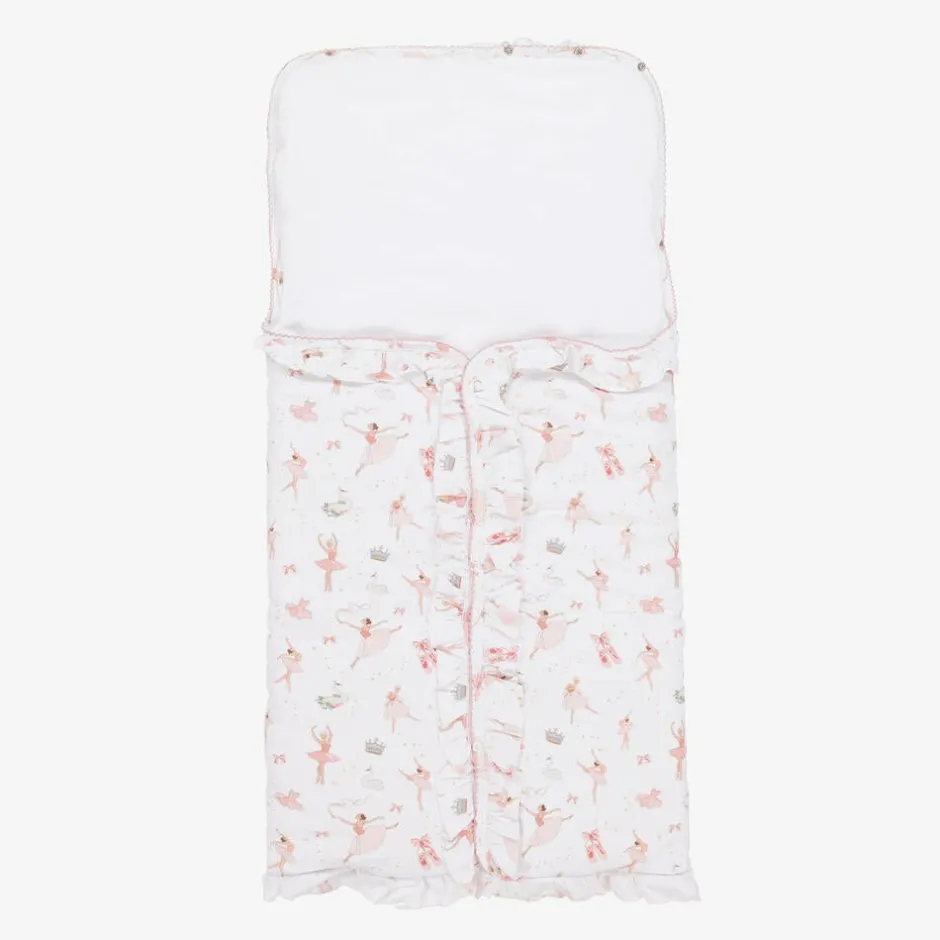 White nest for baby girls by My Little Pie, made from beautifully soft organic Supima cotton jersey and gently padded for an extra cosy feel. It is patterned with a charming ballerina and swan design in pink and edged with a pretty ruffle and embroidered, pink picot trim. There are popper fastenings on the front and hood, allowing it to be opened and laid flat, providing a comfortable surface for changing or playing.