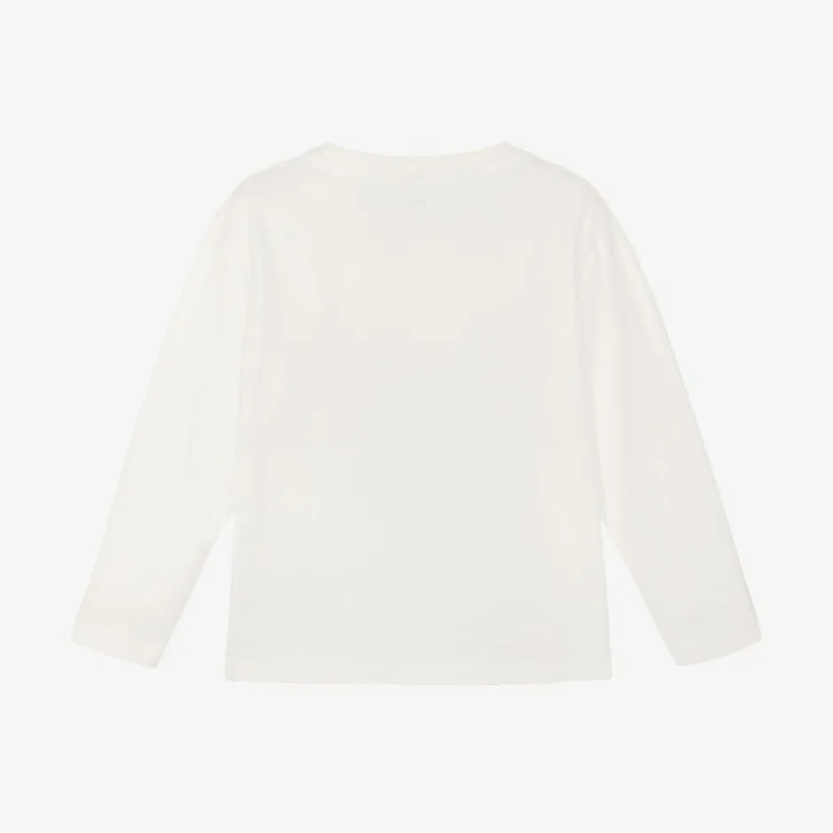 Ivory long-sleeved top for girls by Danish brand Name It, made in soft cotton jersey. It has a stylish dipped hem and a cute penguin wearing a bobble hat and ice skates on the front complete with gold glitter for a sparkly festive finish
