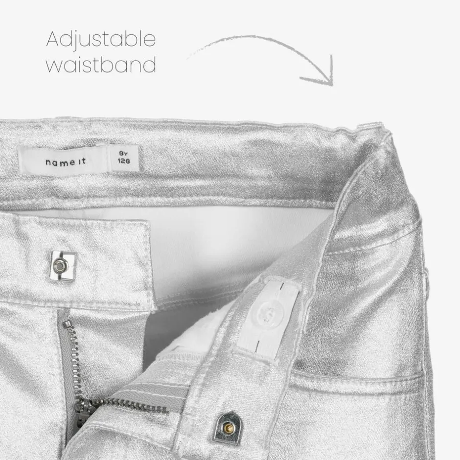 Great for a casual party look, these metallic silver straight-leg jeans for girls are by Name It. Smooth and stretchy, this eye-catching style has an adjustable waist for a comfortable fit. Designed with the classic five-pocket detailing, they fasten with a zip and hook on the front.